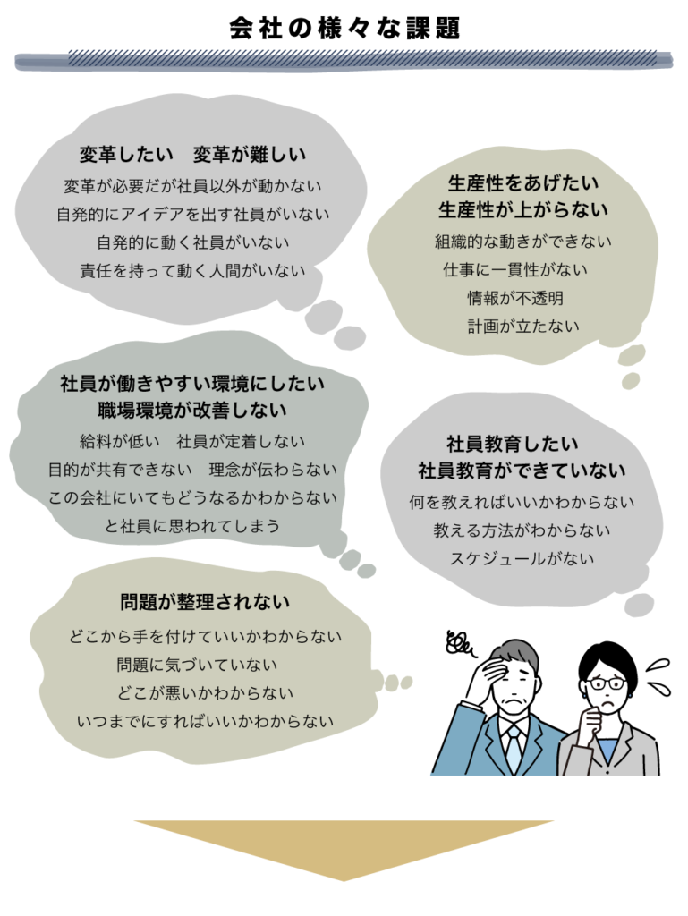 インフラも売れ筋商品も価値観も代わり、顧客、社員、外注先、業務の形態はもとより、あらゆるものが変化を続け、会社が発展するため、その未来のため、経営者は会社内外に対して様々な対応をしていかなければならない、企業が多いのではないでしょうか?そこで以下の課題が必須となってきます。